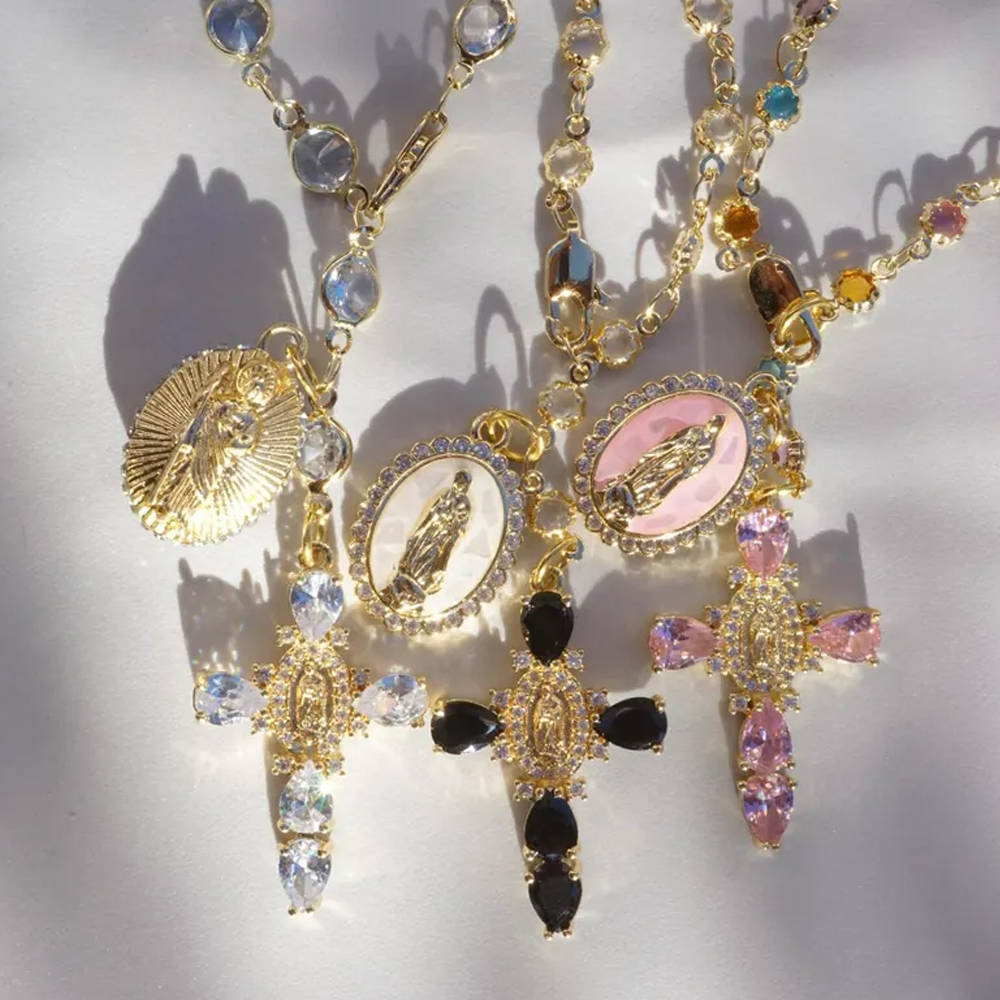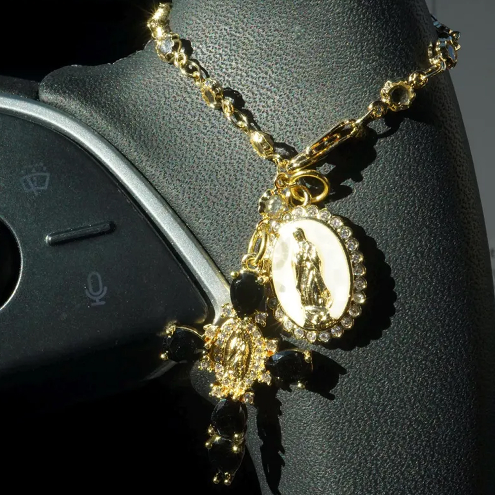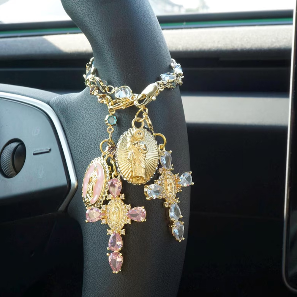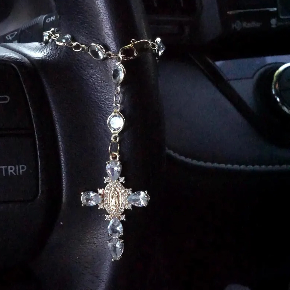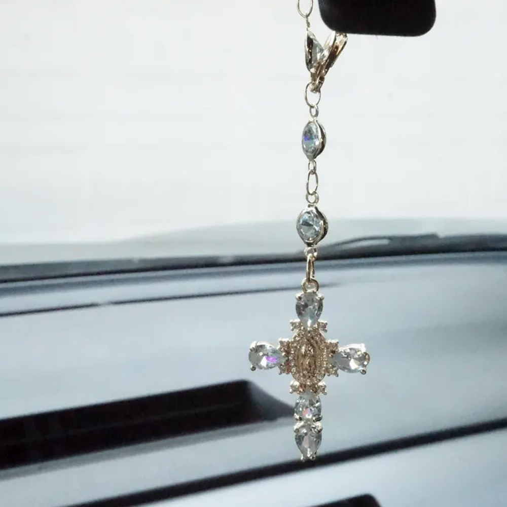Spiritual Car Charm – This elegant hanging ornament features a delicate Virgin Mary medallion and a graceful cross adorned with sparkling crystals. With a soft glow and sacred symbolism, it adds a quiet sense of peace and protection to every drive.