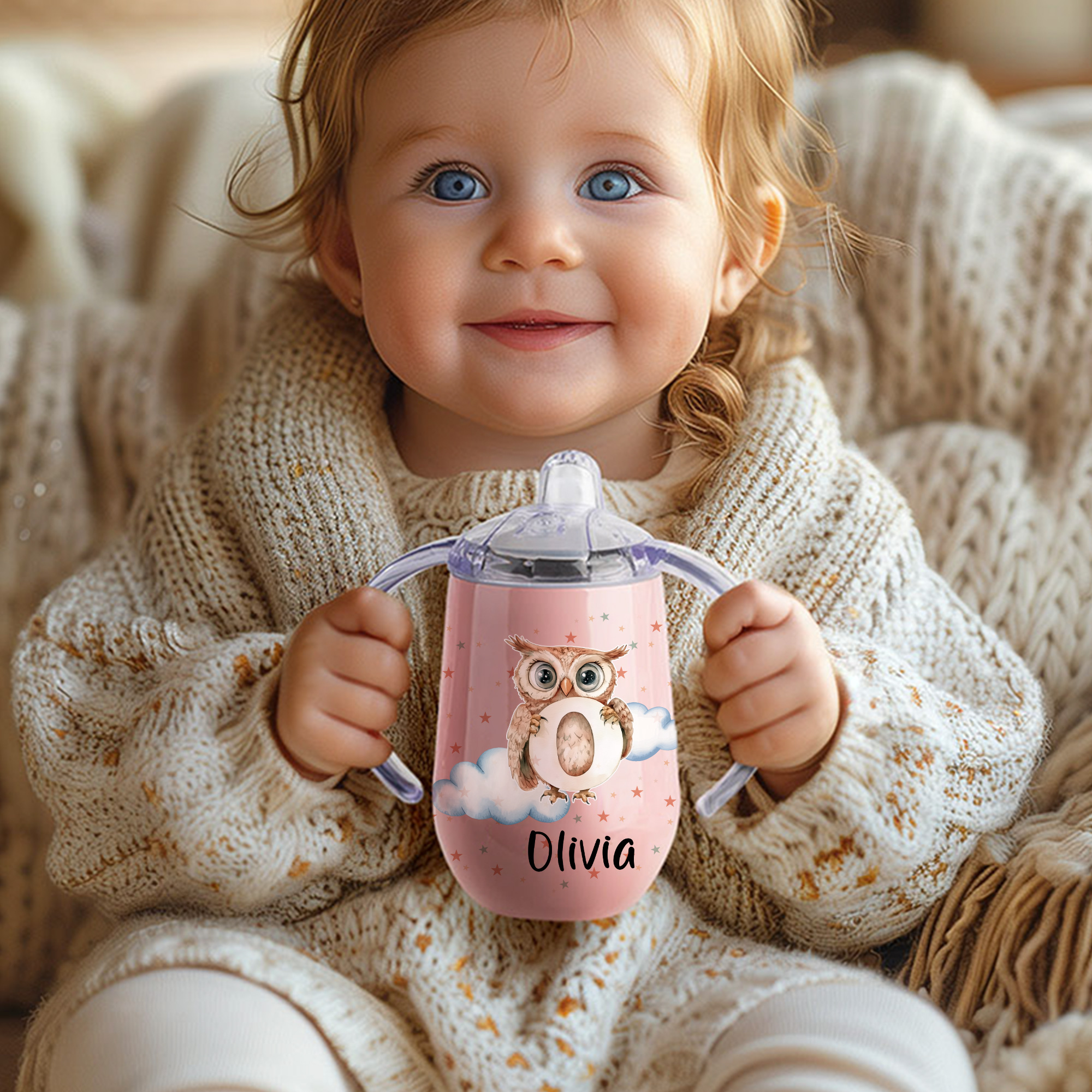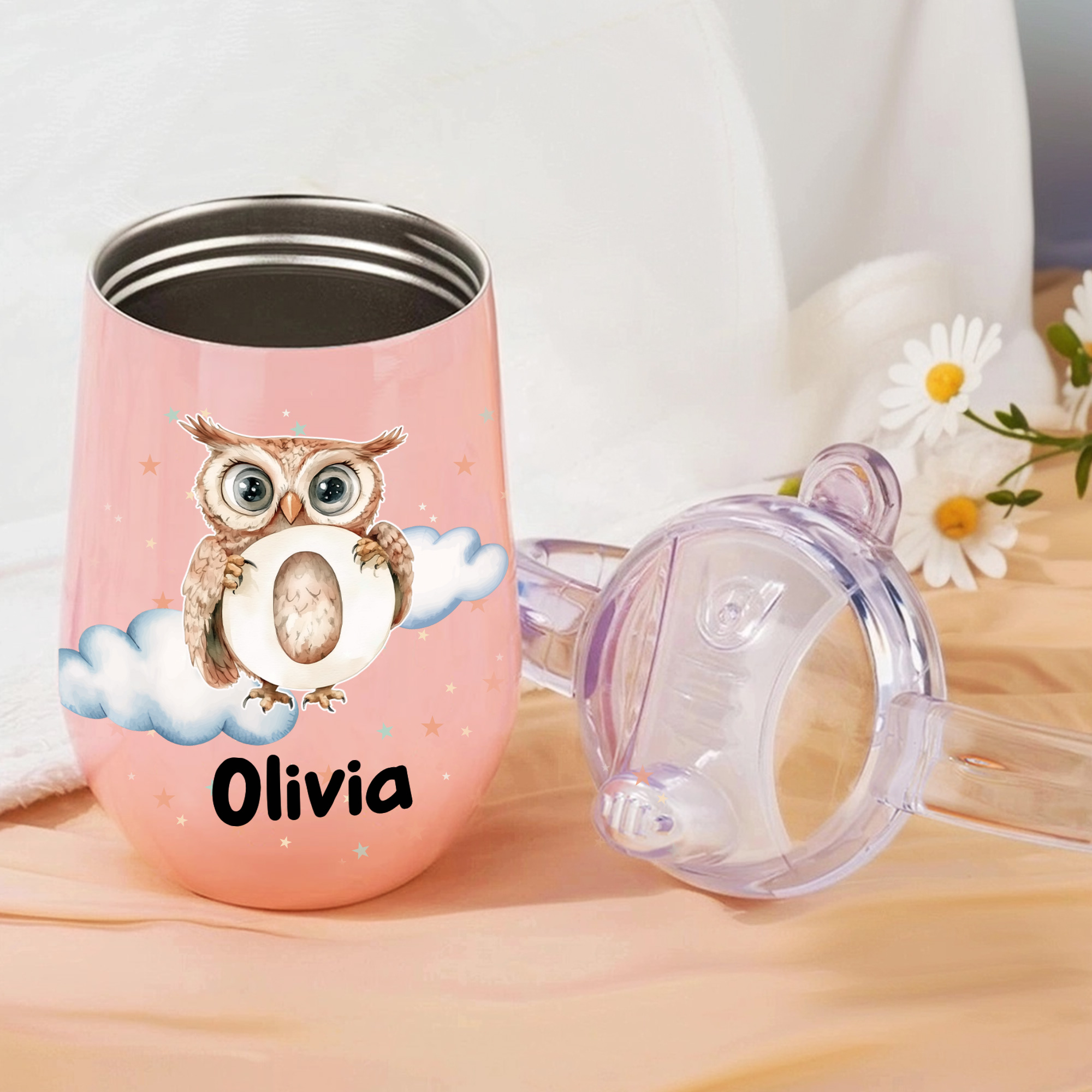Watercolor Animal Design – A soft watercolor animal nestles inside a letter on this charming sippy cup. Gentle clouds and stars float around the design, creating a dreamy, playful look that delights young eyes.