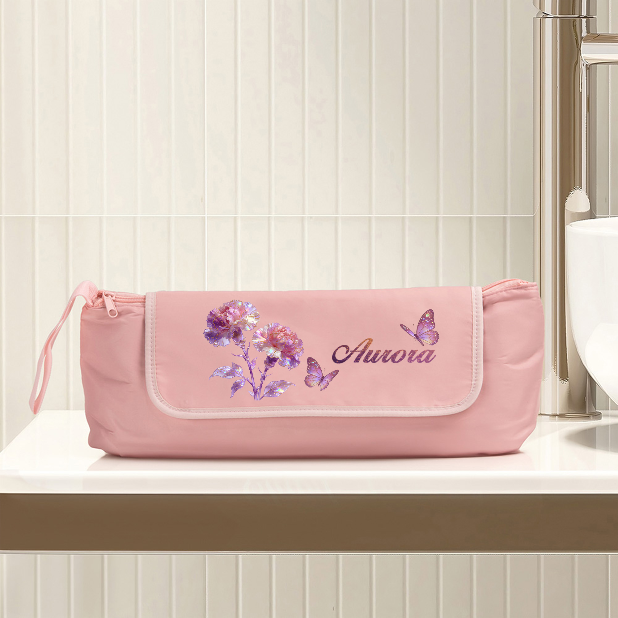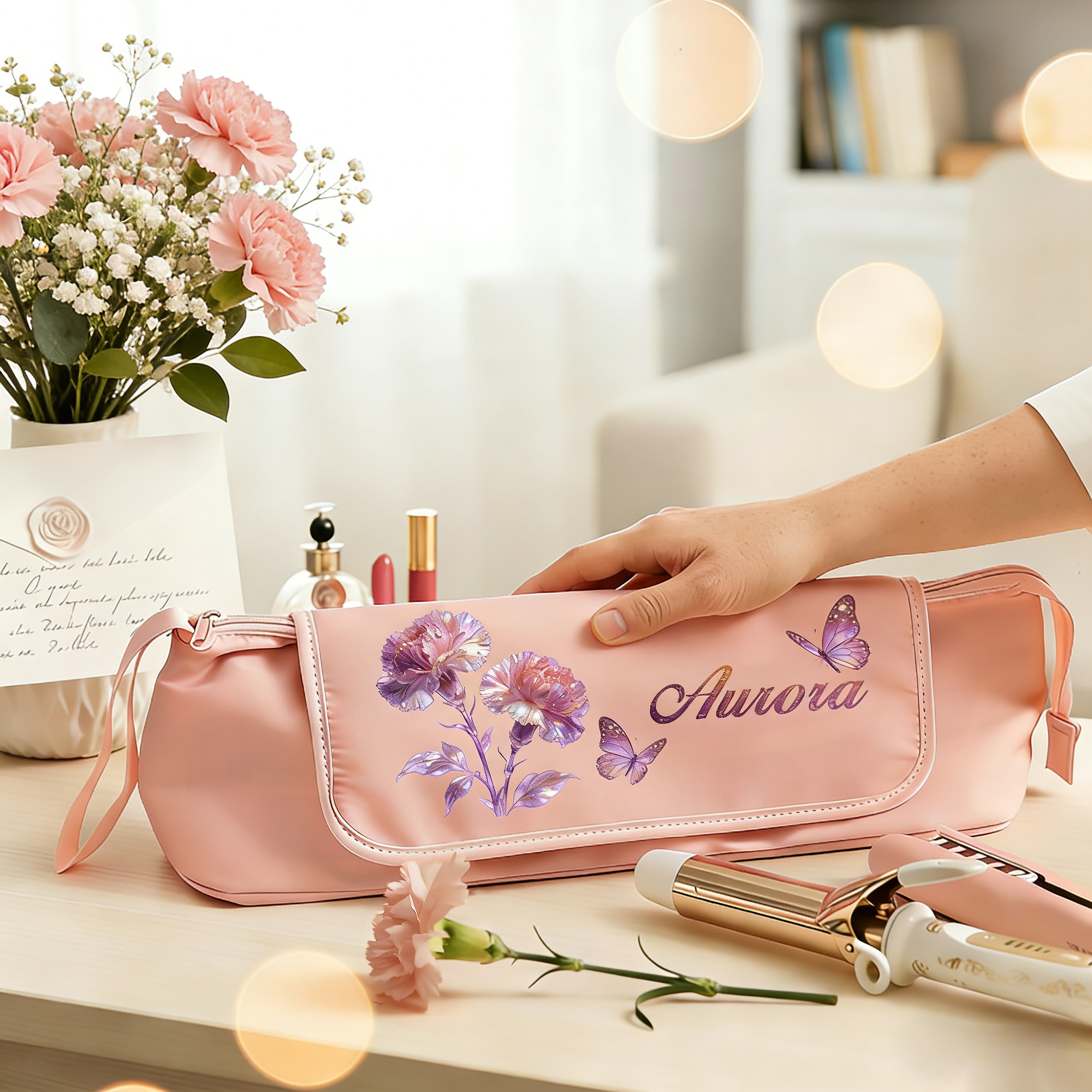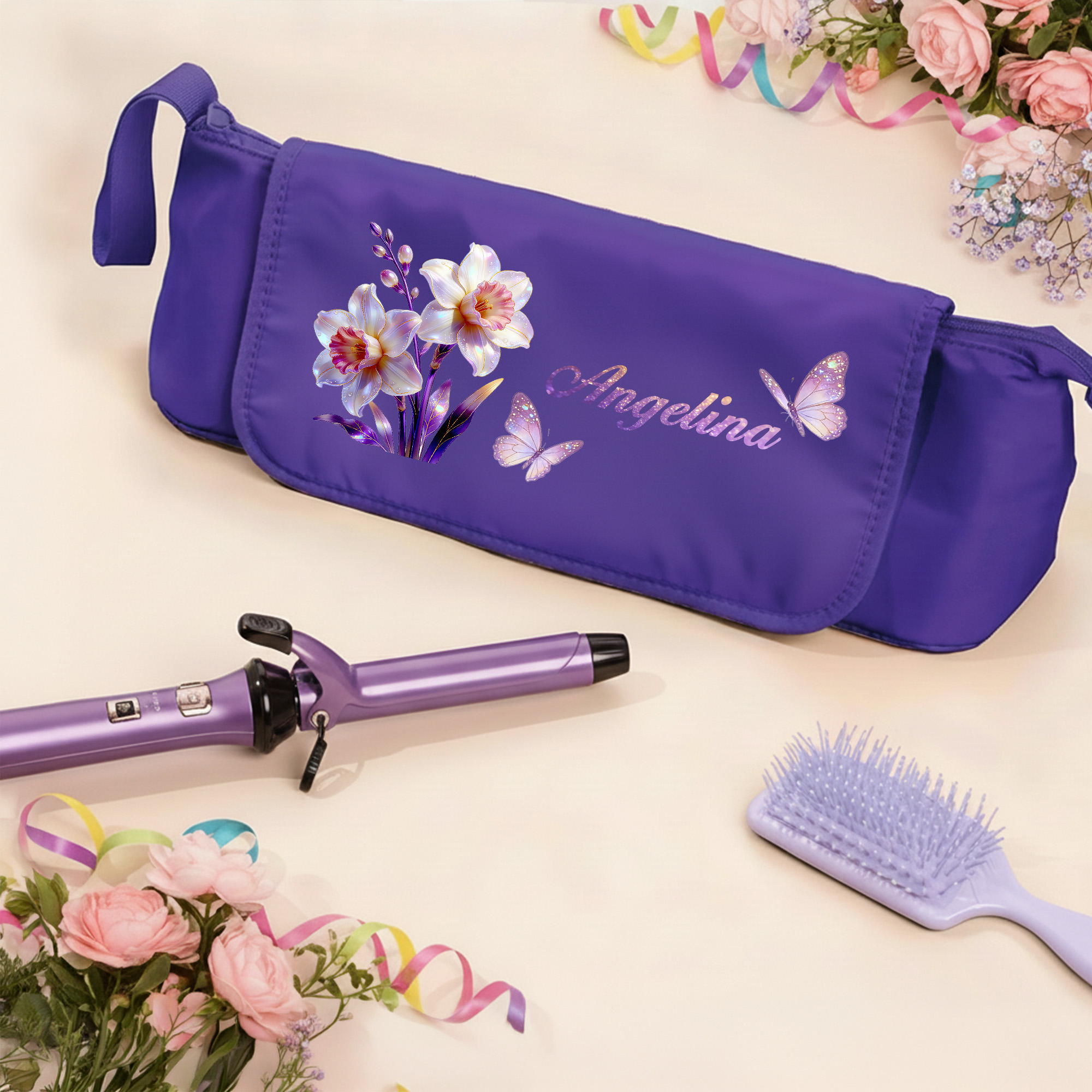 Watercolor Birth Flower – This storage bag features a soft watercolor illustration of a birth month flower, rendered in gentle pastel tones. The elegant artwork brings a calming, feminine touch to daily styling routines and travel essentials.