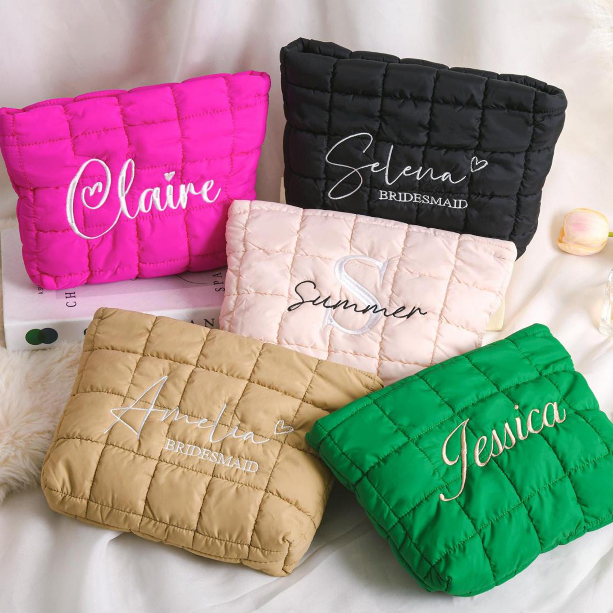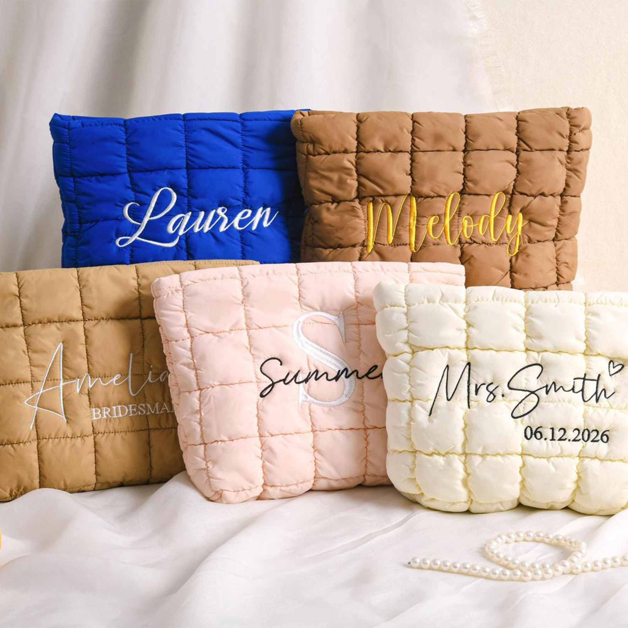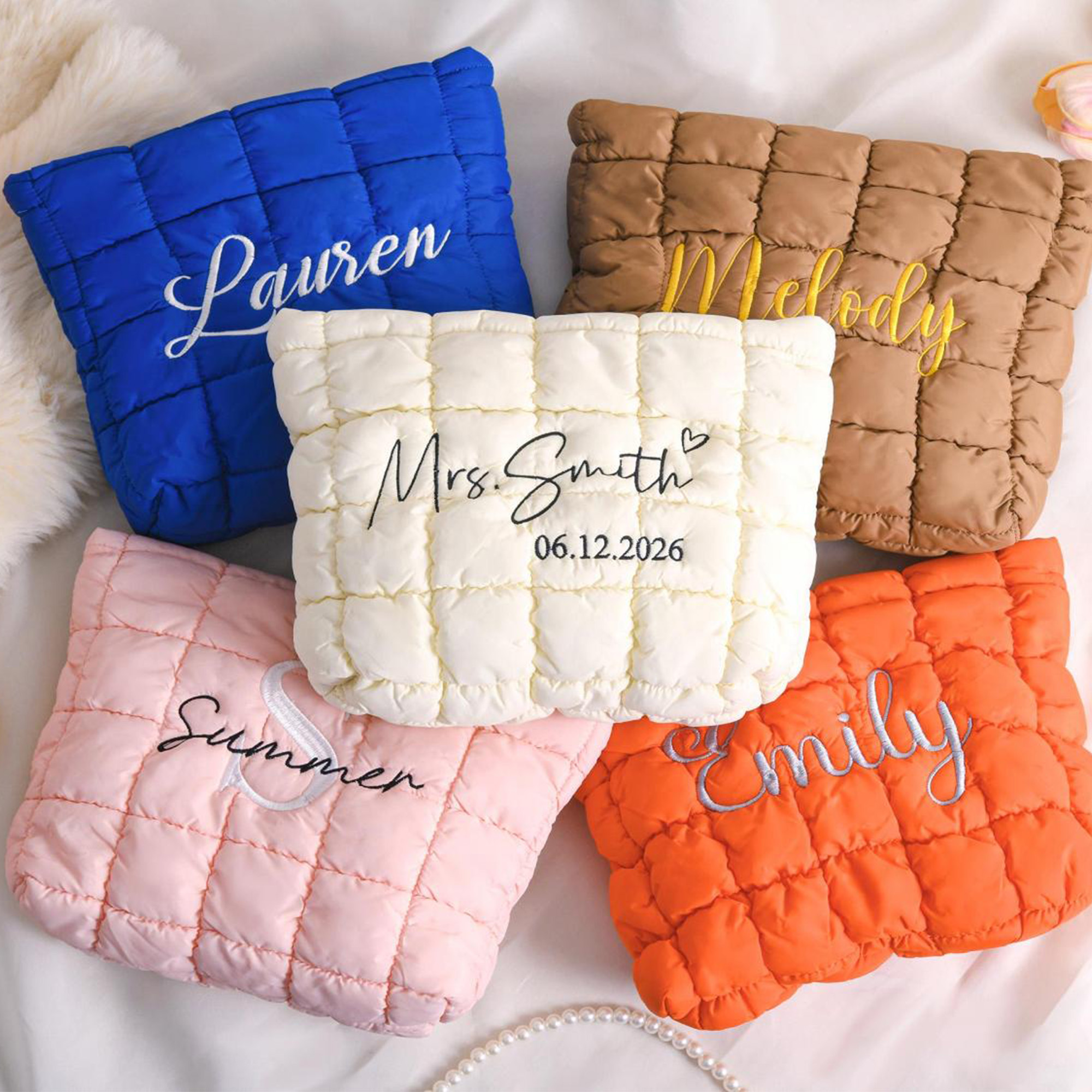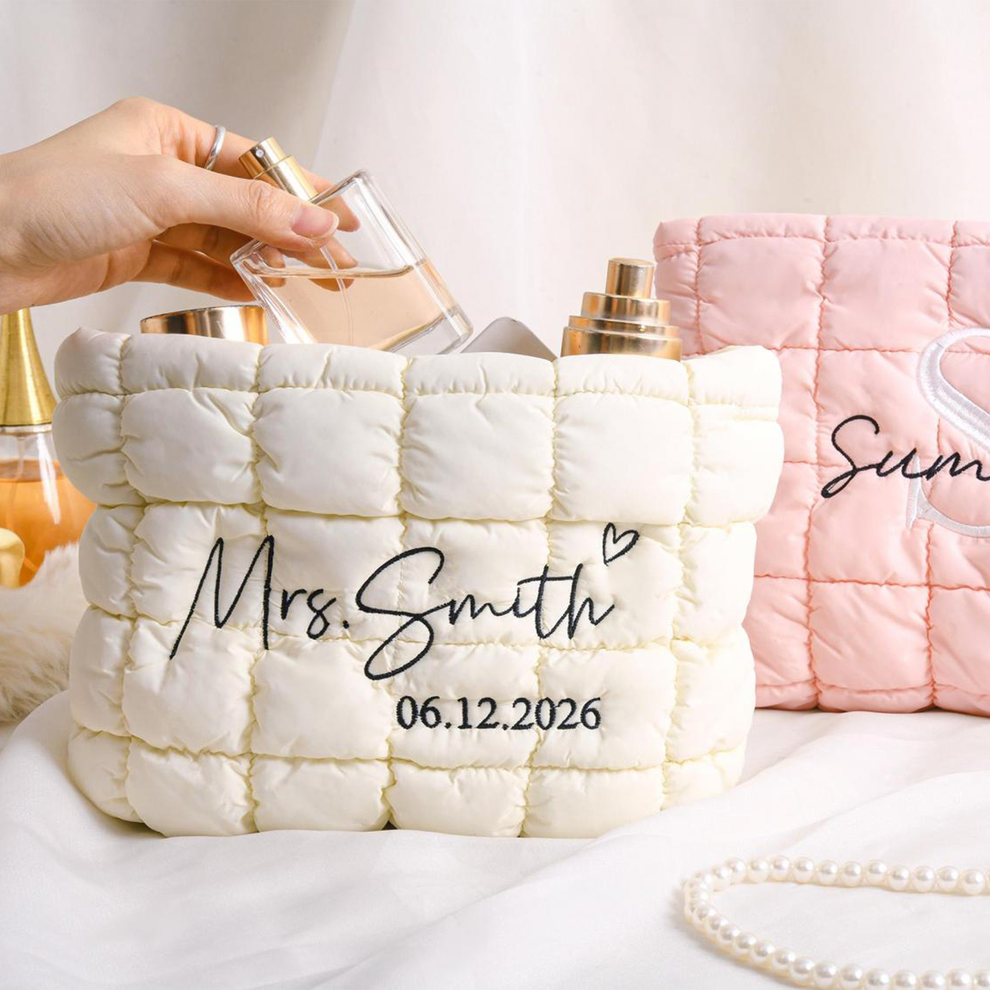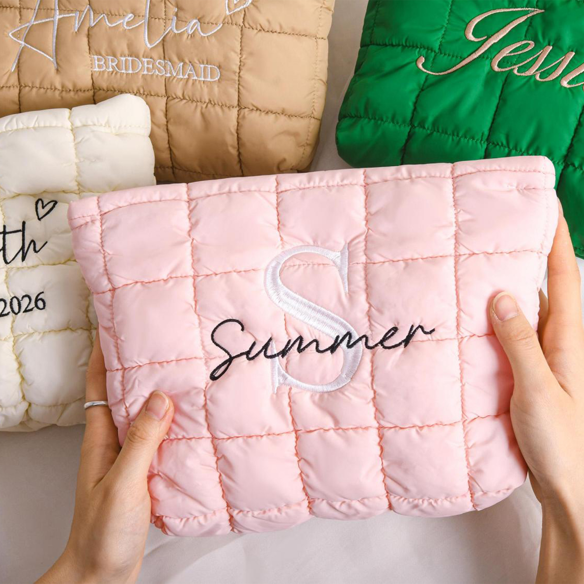 Quilted Makeup Bag – A soft, quilted cosmetic bag with a personalized name or monogram, designed to hold essentials in style. Its elegant texture and thoughtful details make it a perfect companion for daily use or special occasions.