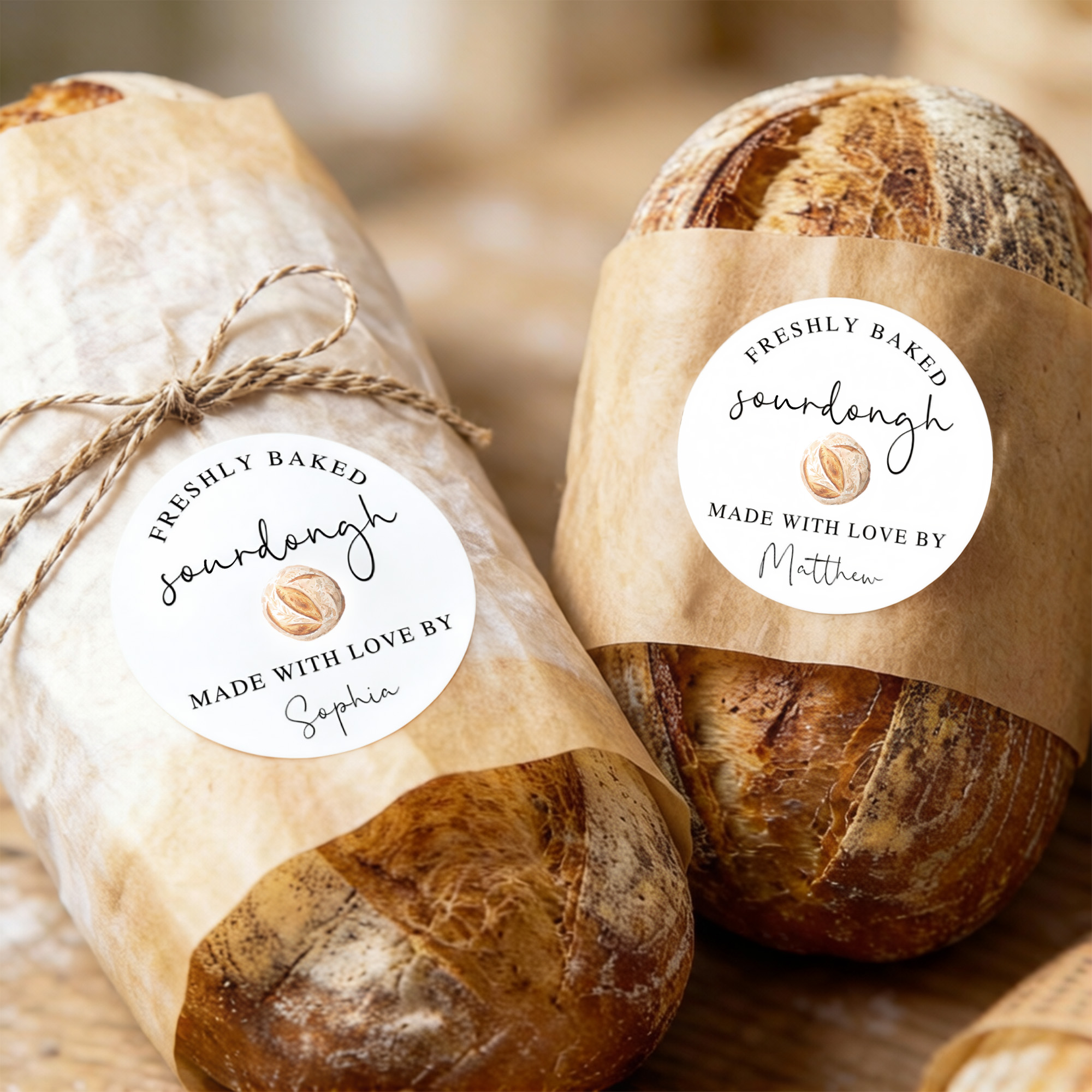 Artisan Sourdough Theme - The round sticker features a warm sourdough-inspired design with elegant text and a handmade bakery feel. The simple layout highlights the charm of home baking and adds a thoughtful finishing touch to bread packaging, treat bags, or pastry boxes.