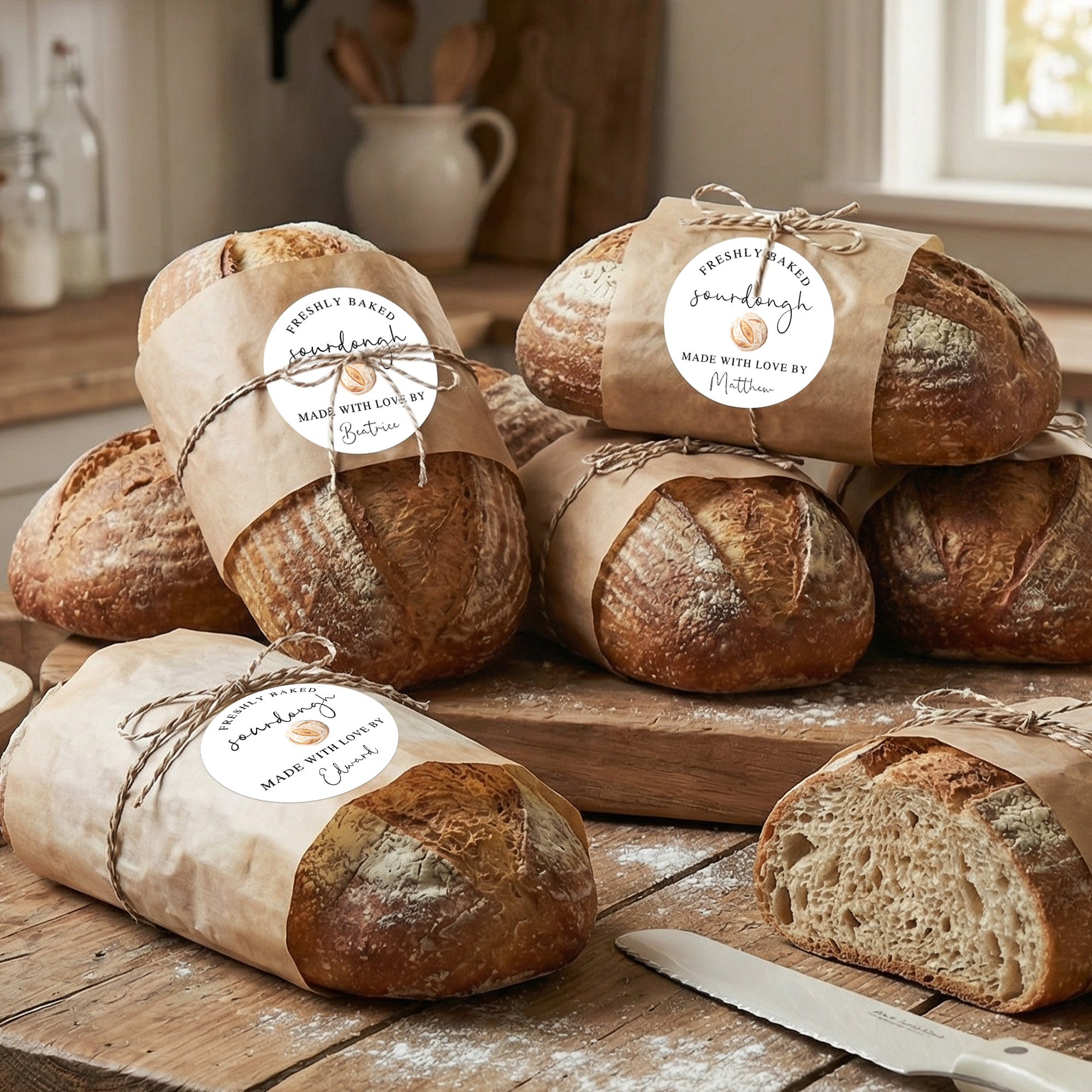 Multipurpose Baking Labels - These round stickers work well on sourdough bread bags, cookie boxes, pastry packaging, gift wrap, mason jars, or thank-you cards. They are a simple way to add a professional bakery-style label to homemade treats or small business packaging.