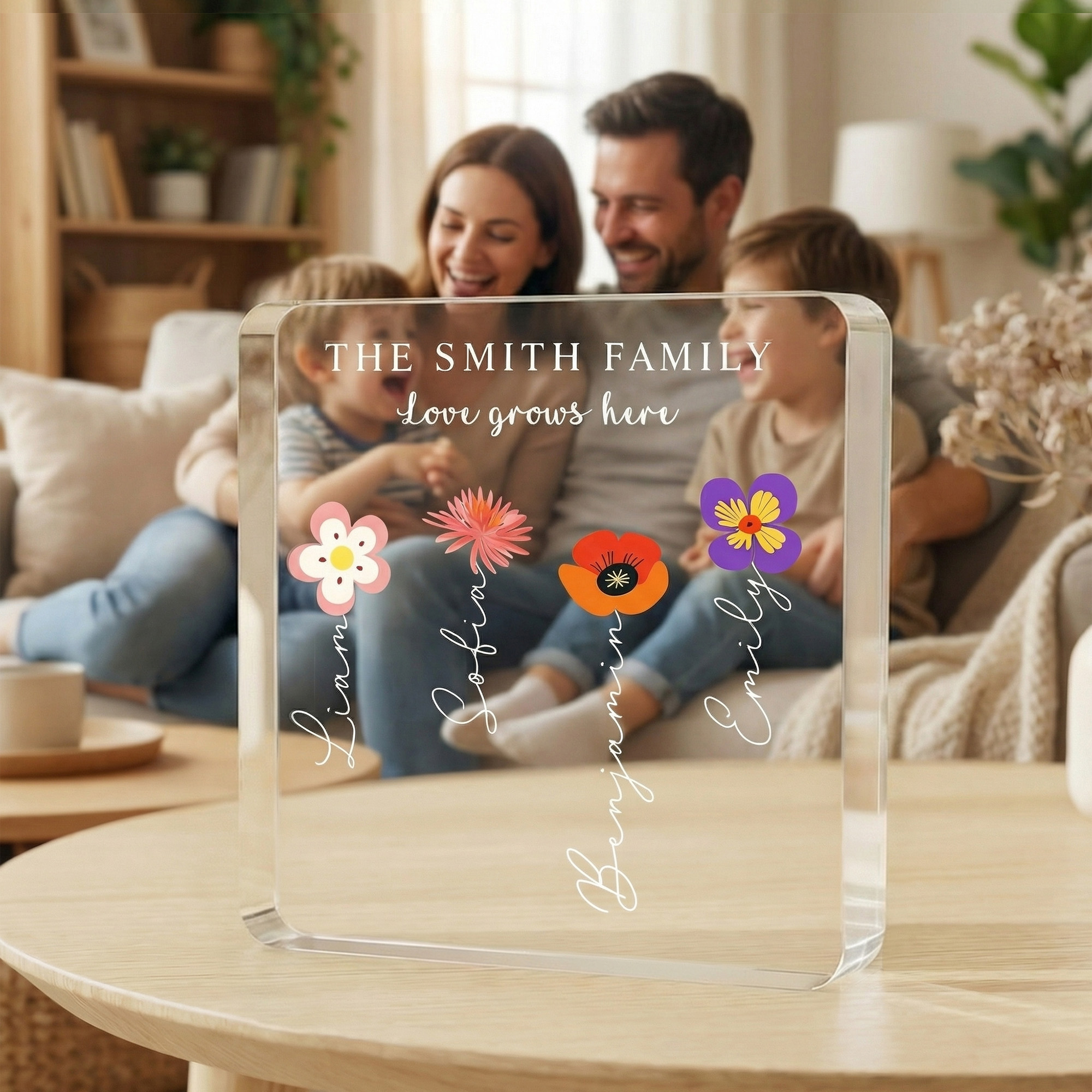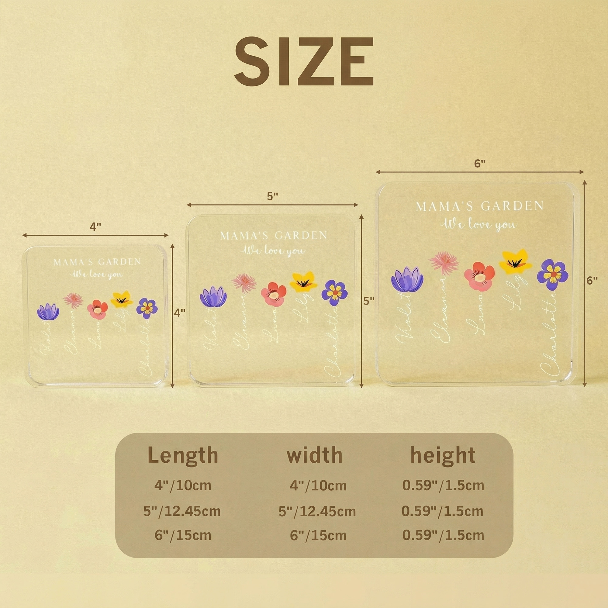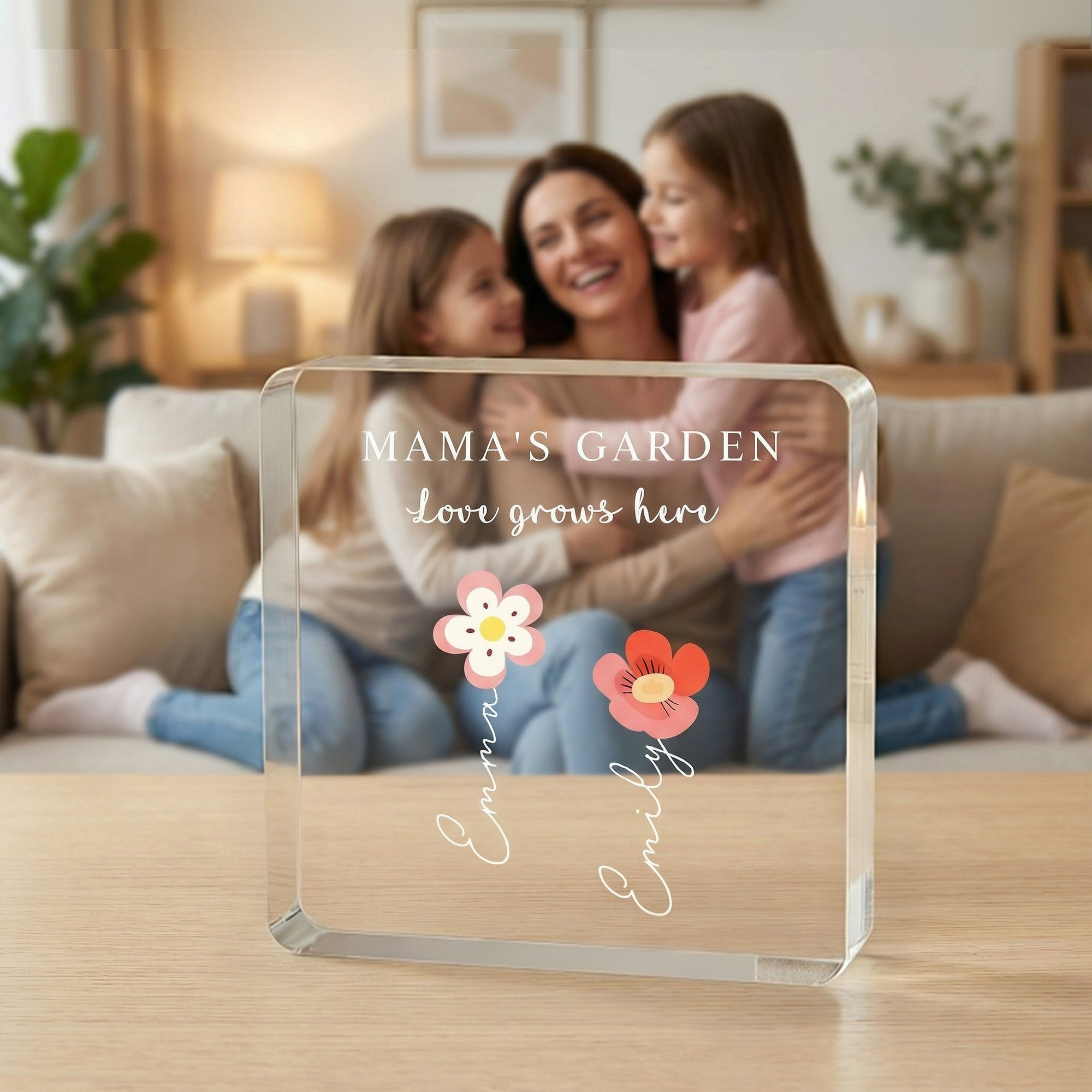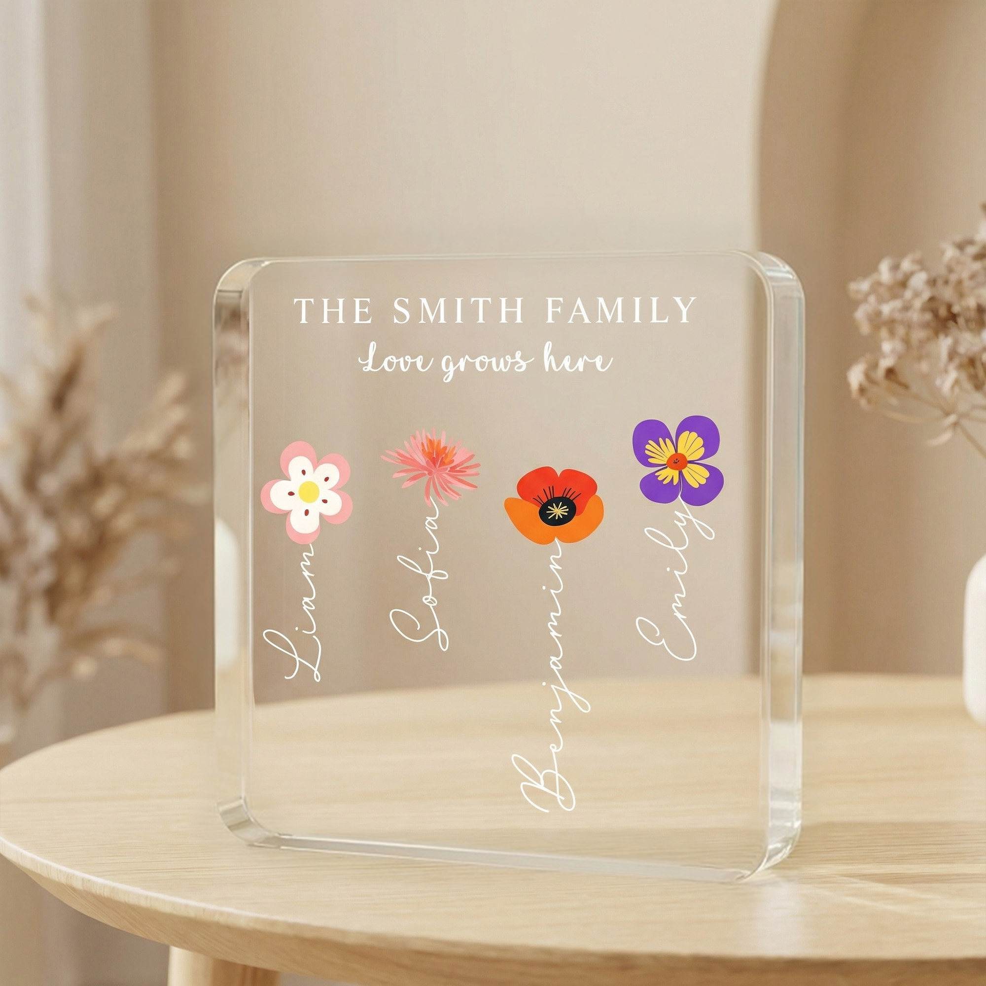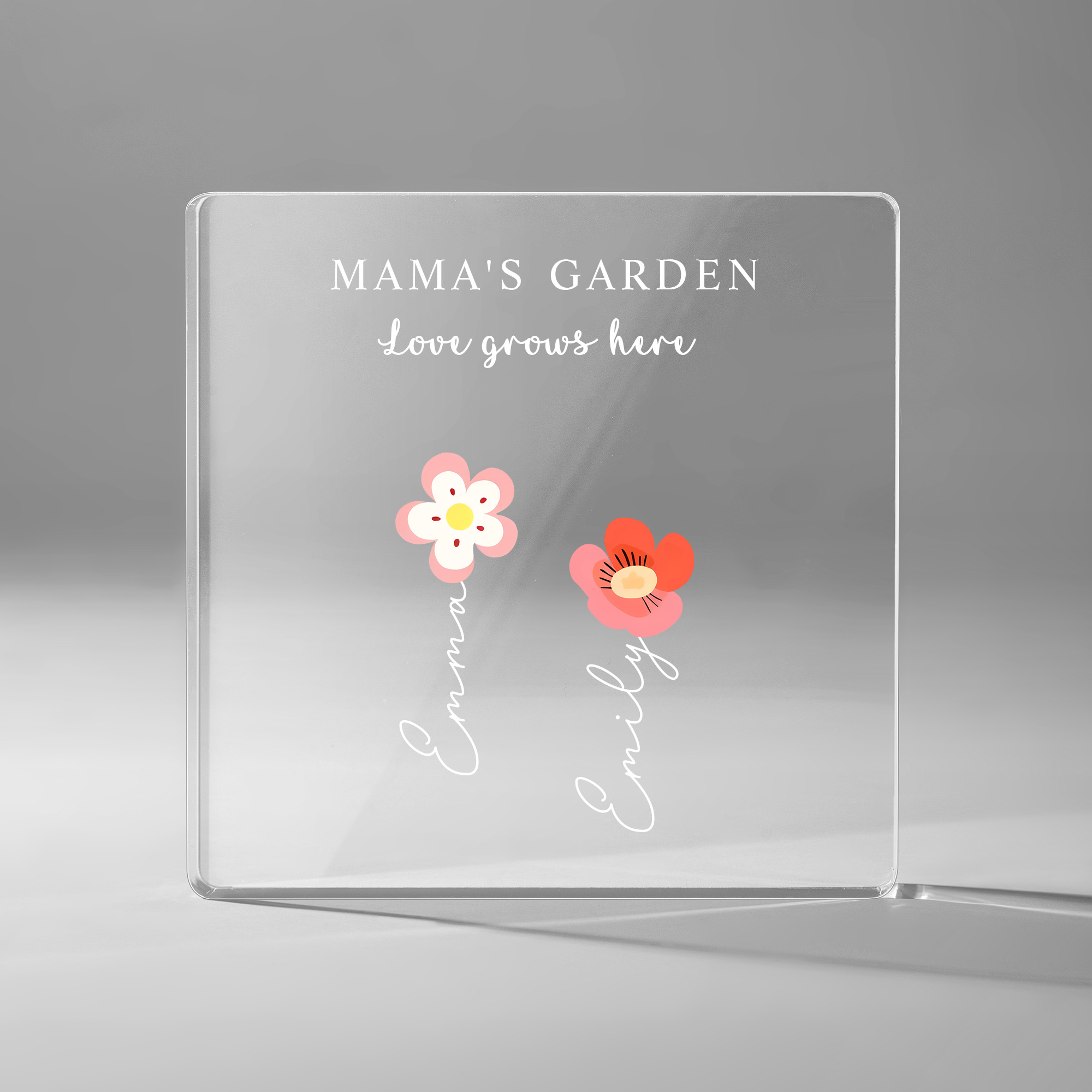 Garden of Love Design - This plaque comes in a square shape decorated with vibrant birth flowers, each representing someone special in mom’s or grandma’s garden. The lively floral elements bring a cozy and uplifting feel, adding charm to any desk or shelf.
